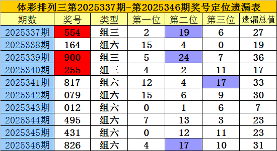 开奖回想:胪列三第2025346期奖号为:826,诸位号码遗漏值差别为4、17、10,遗漏总值为31。